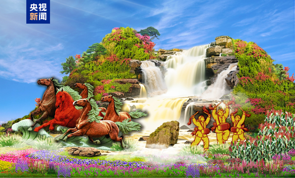 东单西南角——“锦绣山河”花坛以高耸的万里长城为主景,配以络绎山间的小火车、雨后春笋的红叶、卢沟桥及赏识美景的游客等,表现祖国的大好河山,书写新时代绿水青山的壮美华章。花坛顶高8.5米。