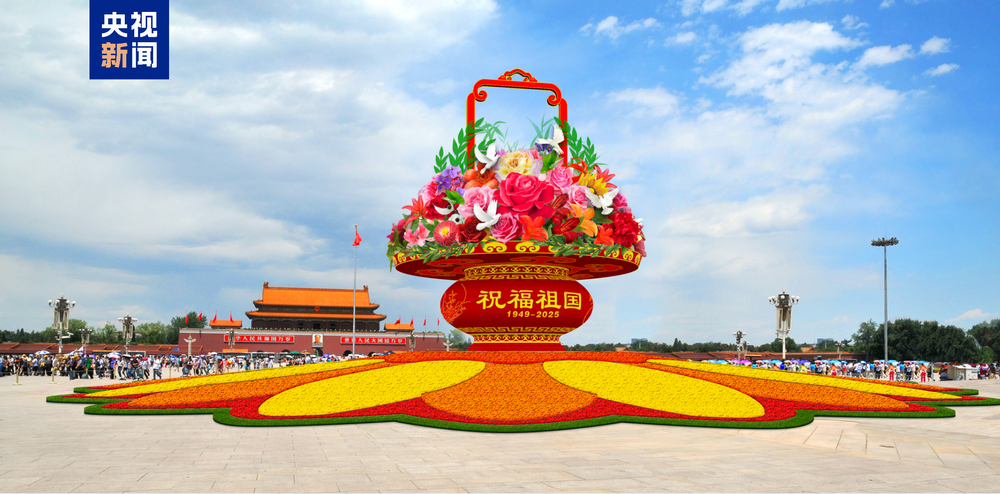 广场中心“祝愿祖国”花坛以喜庆的花篮为主景,花坛底部直径45米,为向日葵图画,涵义葵花朵朵向太阳。花坛顶高18米,篮体高16米,篮盘直径12米。在篮体南侧书写“祝愿祖国,1949—2025”字样,在篮体北侧书写“欢度国庆,1949—2025”字样。篮内选取了夸姣涵义的花卉,其间荷花涵义和和美美、月季涵义平和期望、珙桐涵义平和之树、橄榄枝涵义荣耀平和、向日葵涵义自在夸姣、山丹丹涵义团结猛进、英雄花涵义英勇无畏,结合平和鸽元素,表现“平和开展、蒸蒸日上”,表达对祖国昌盛富足的夸姣祝愿,对世界平和开展夸姣期盼。