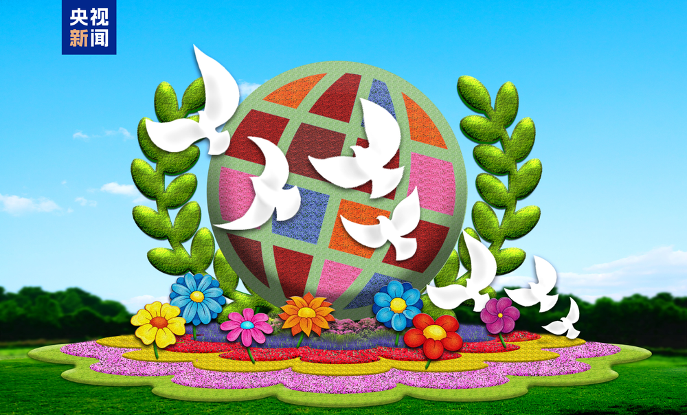 建国门西北角——“平和开展”花坛以地球、橄榄枝、平和鸽为主景,涵义高举平和、开展、协作、共赢的旗号,促进世界平和与开展,推动构建人类命运共同体。花坛顶高8.0米。