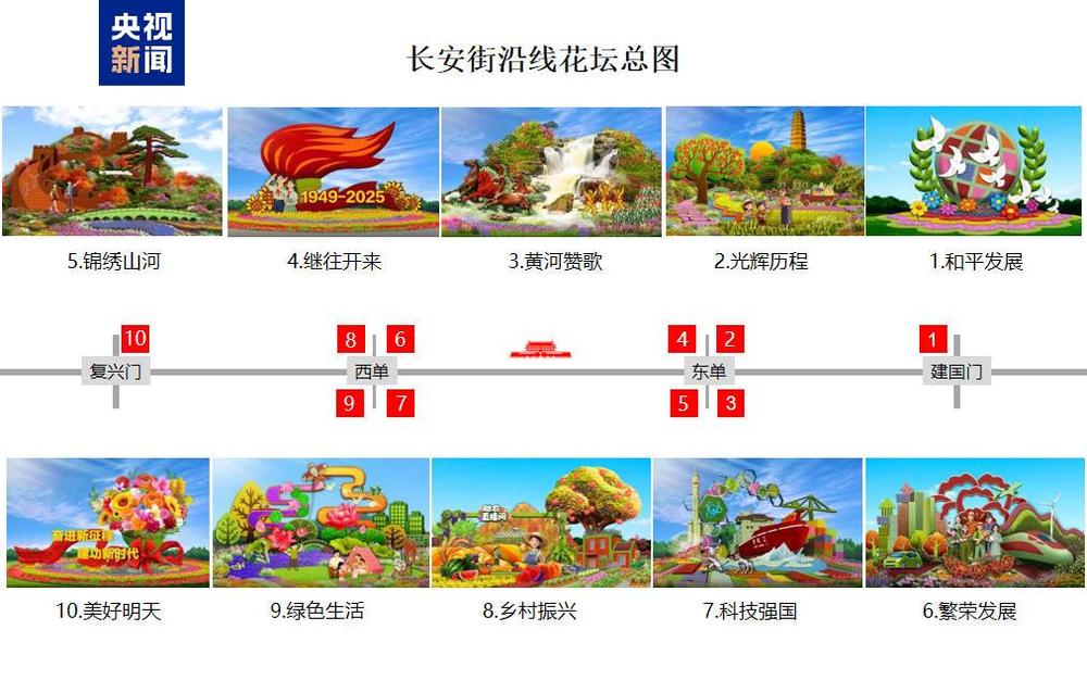 本年,长安街沿线建国门到复兴门之间精心安置10组立体花坛,描绘了祖国昌盛昌盛、公民休养生息的中国式现代化新华章。10组立体花坛从中国公民抗日战役暨世界反法西斯战役成功80周年纪念活动安置后连续国庆,进行元素替换和植物调整,确保出现最佳的现象作用。